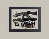 HK MP5 , Glock 17, Met Flat Cap and SO16 Parliamentary Patch Mounted Print 20ins x 16ins. The original artwork was entirely sketched on an iPad Pro 12.9 using the Procreate App. Each print comes with a certificate of authenticity with it's unique print run number and each p...