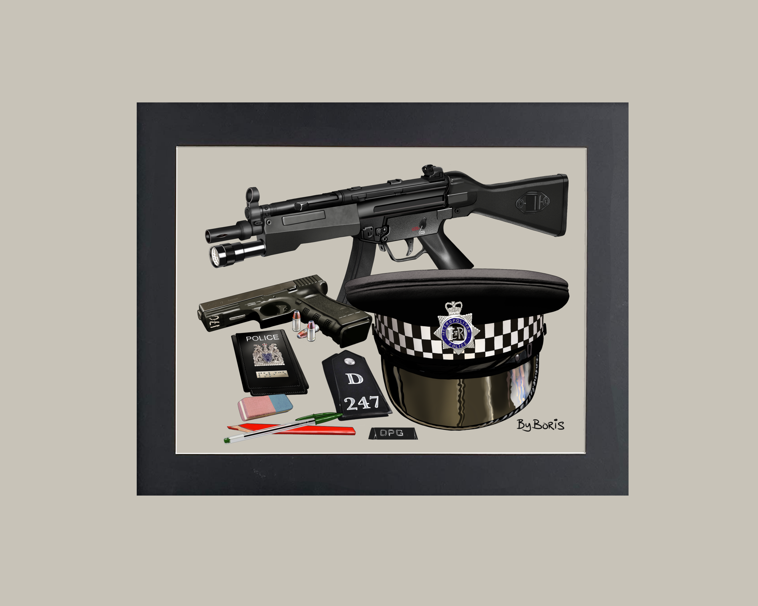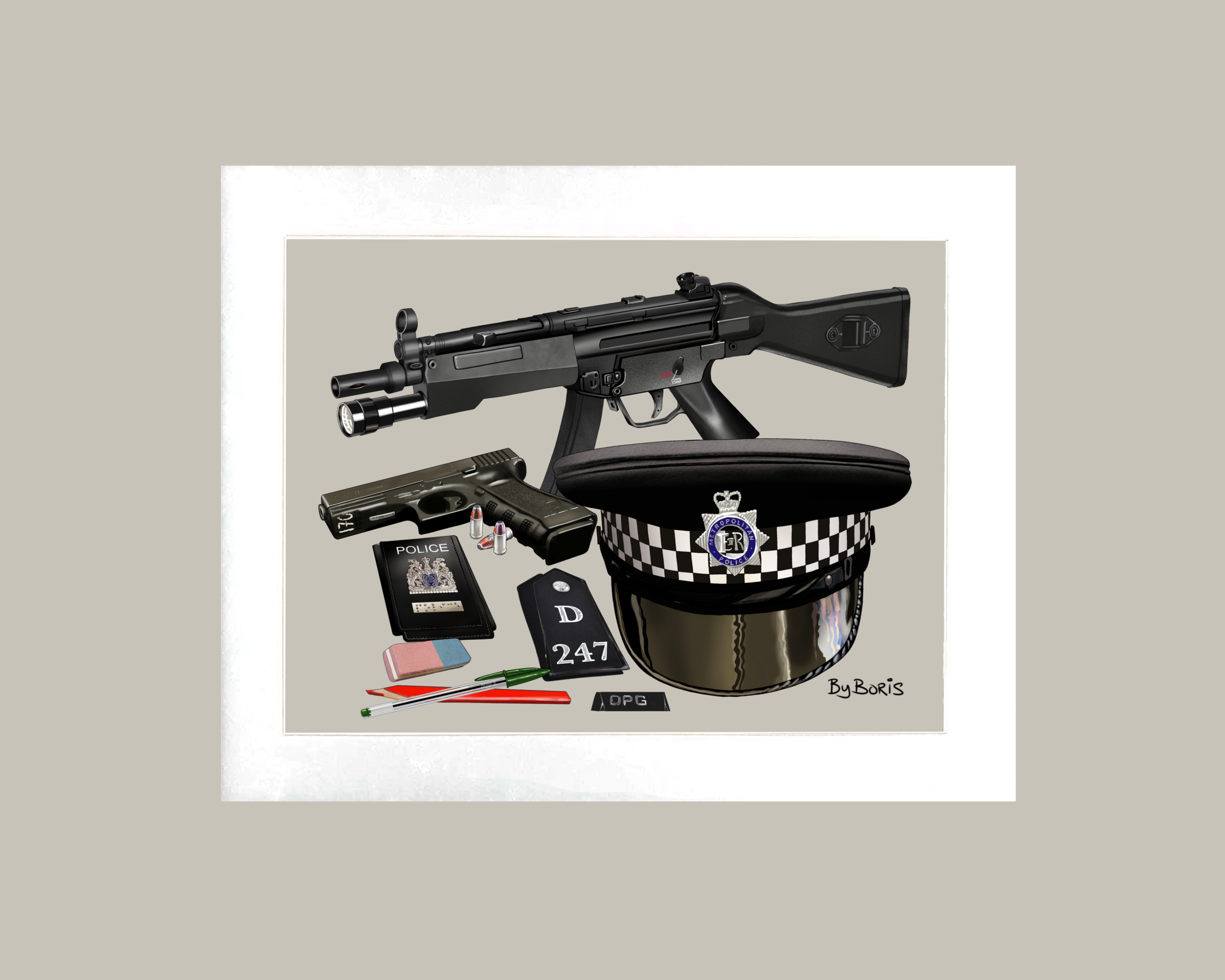 Well I finally finished my latest By Boris police unit themed art, this is my very own special take on that very staunch outfit I knew as “Door, Parks and Gates”, or “Disco’s Parties and Gigs” or who you may know as the DPG. In this montage, I’ve included the H & K MP5, Glock 17, Met Flat Cap, Warrant Card, Epaulettes and pen and pencil.