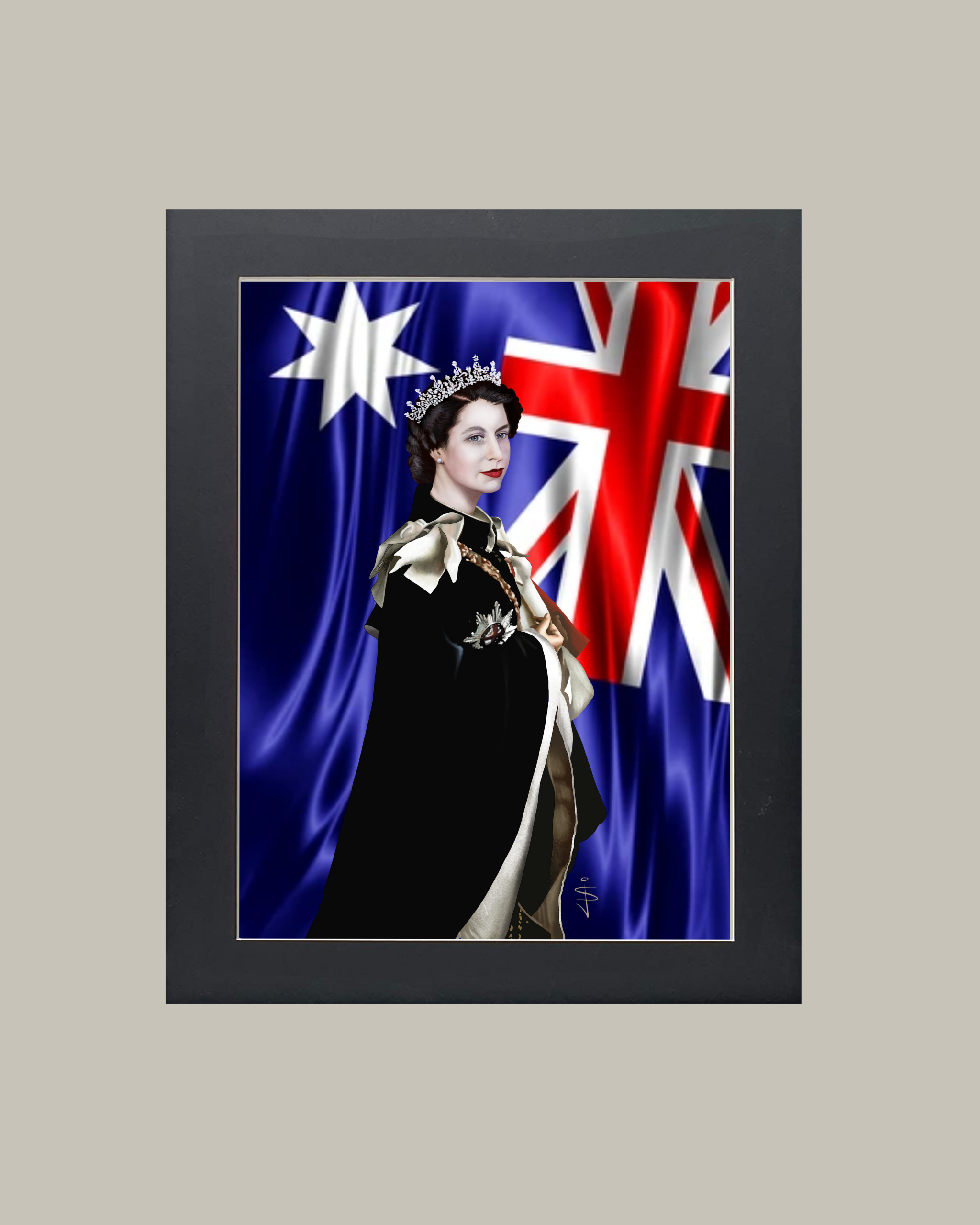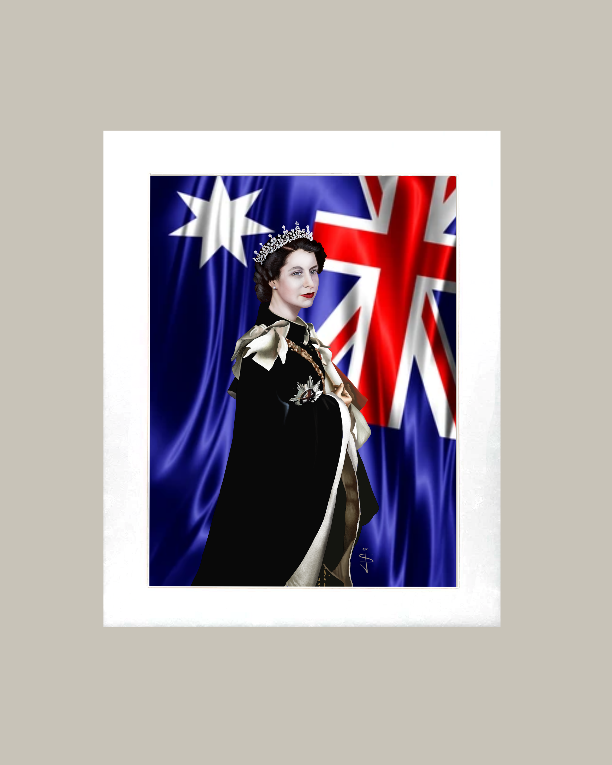 Elizabeth II Australian Flag Mounted Print 20ins x 16ins.