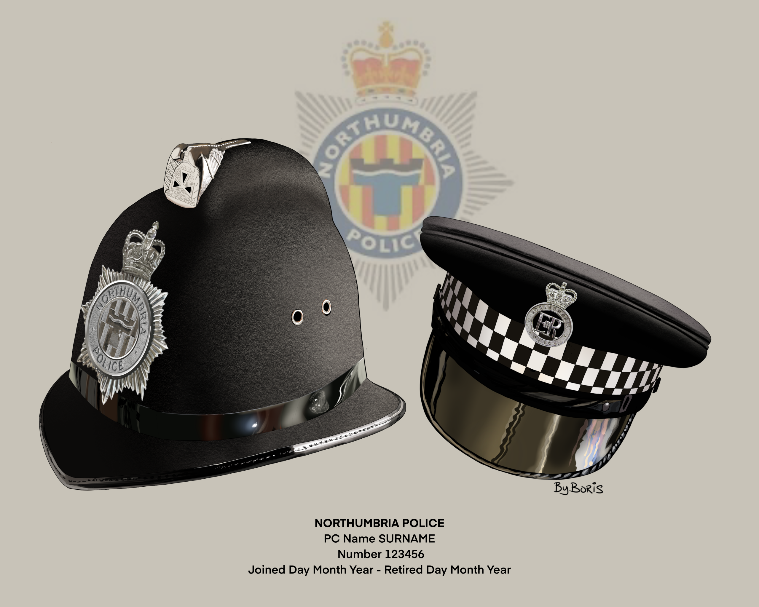 This is a digital illustration of the Northumbria’s Police Helmet and Flat Cap which can be personalised (please provide Name, Rank, Warrant no. and Dates Joined and Retired/Left).