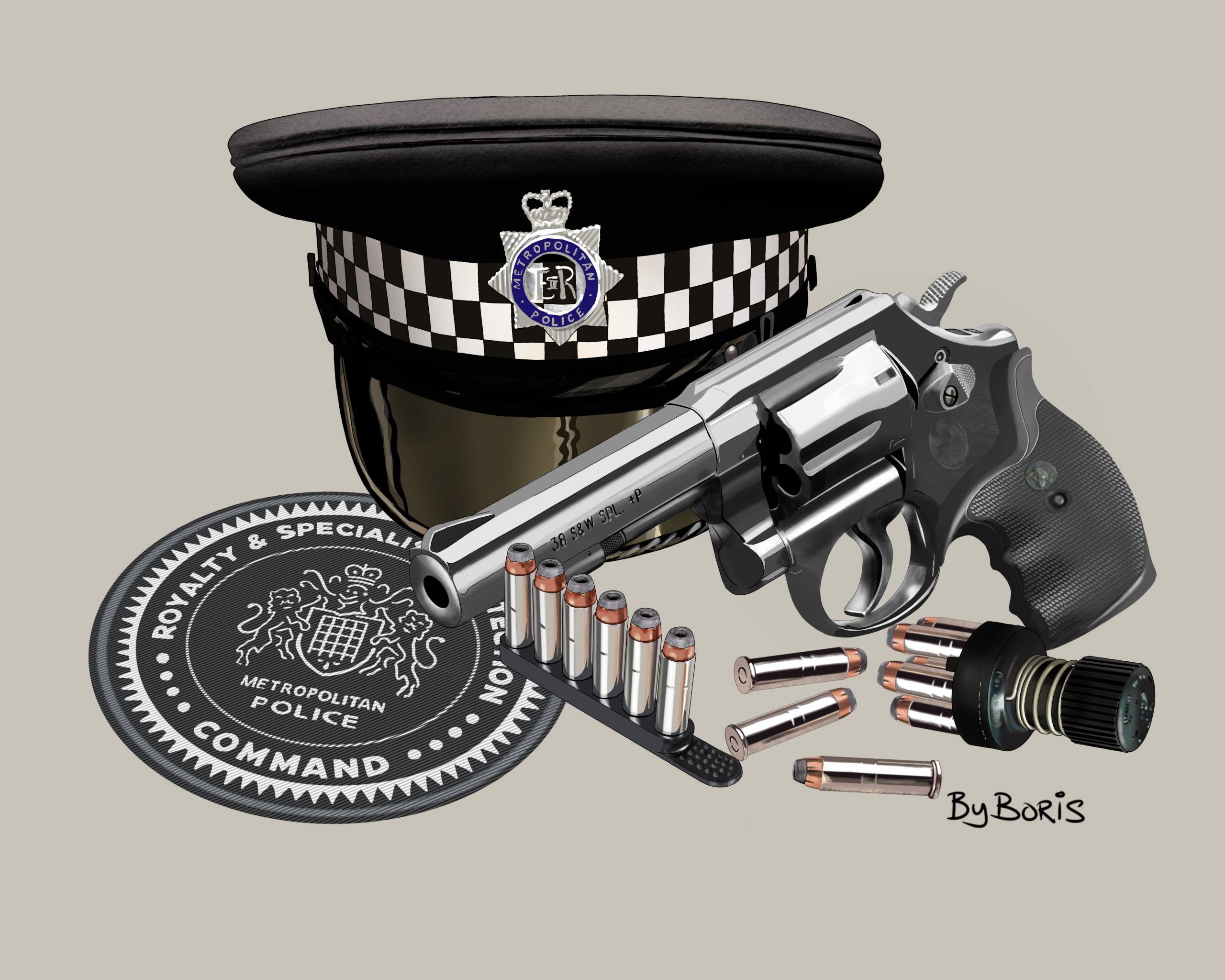 RaSP Patch, Met Flat Cap, Smith & Wesson Model 10 Rubber Grips and Ammo Mounted Print 20ins x 16ins.