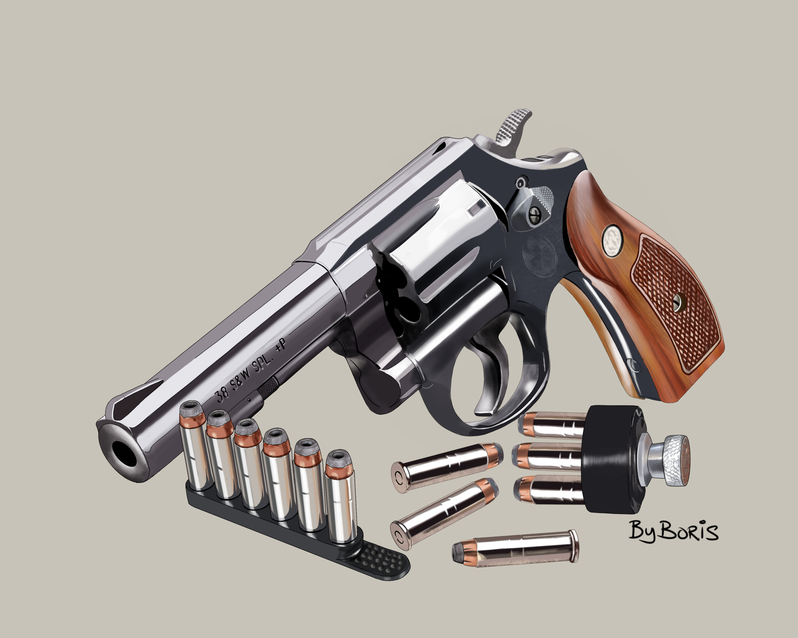 Smith & Wesson Model 10 and Shells and Speed Loader Mounted Print 20ins x 16ins.