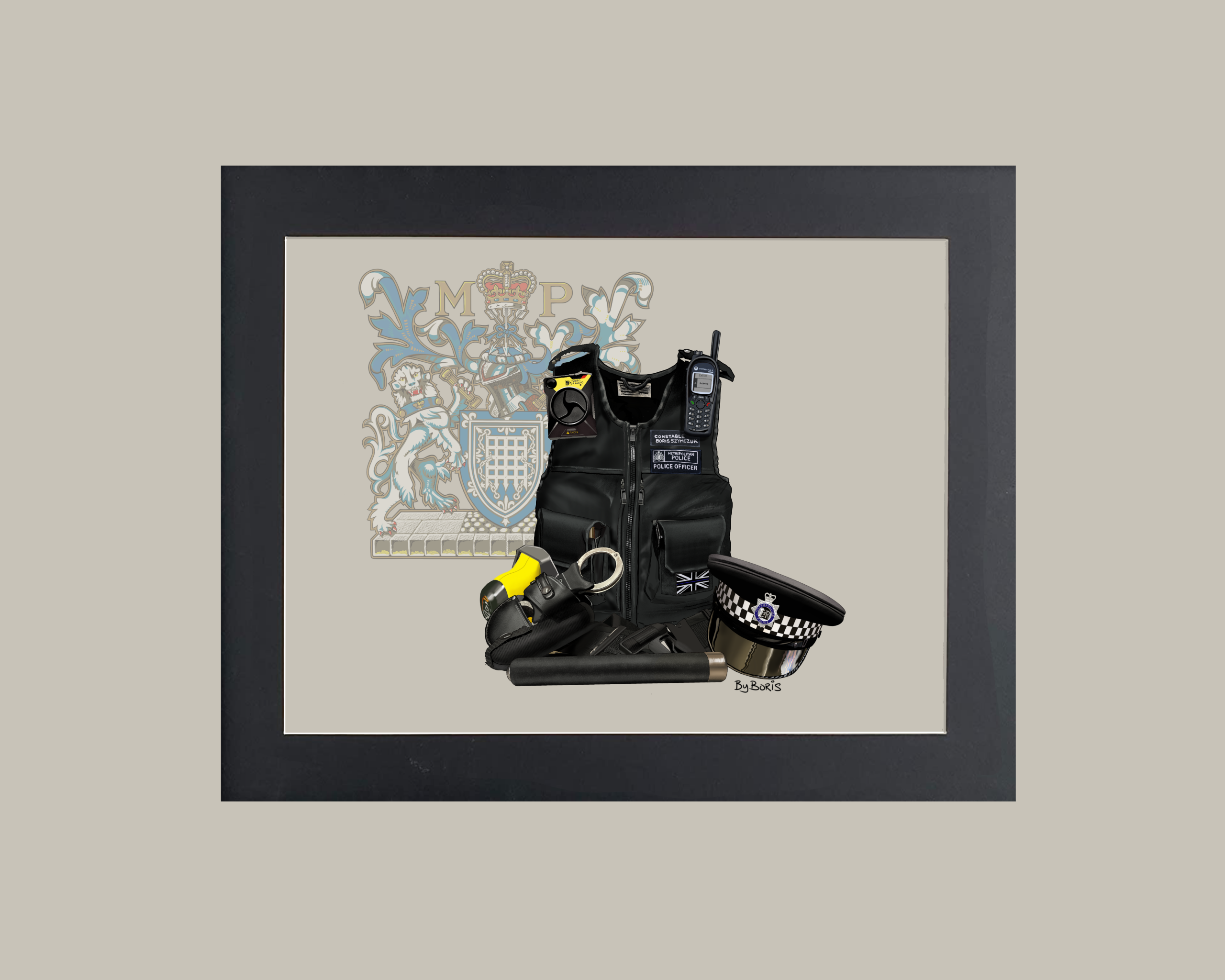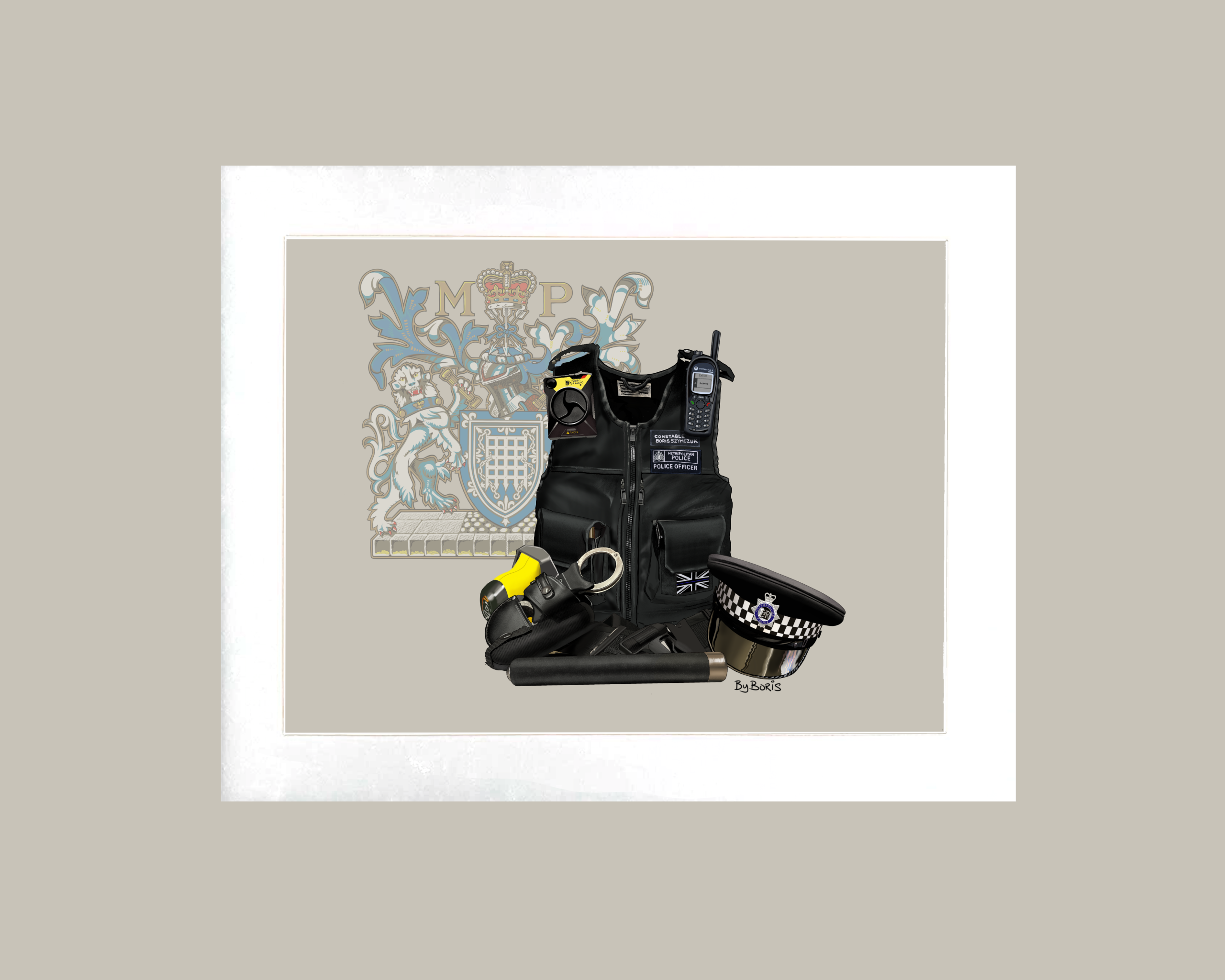 Met Stab Vest, Belt and Flat Cap Mounted Print 20ins x 16ins.
