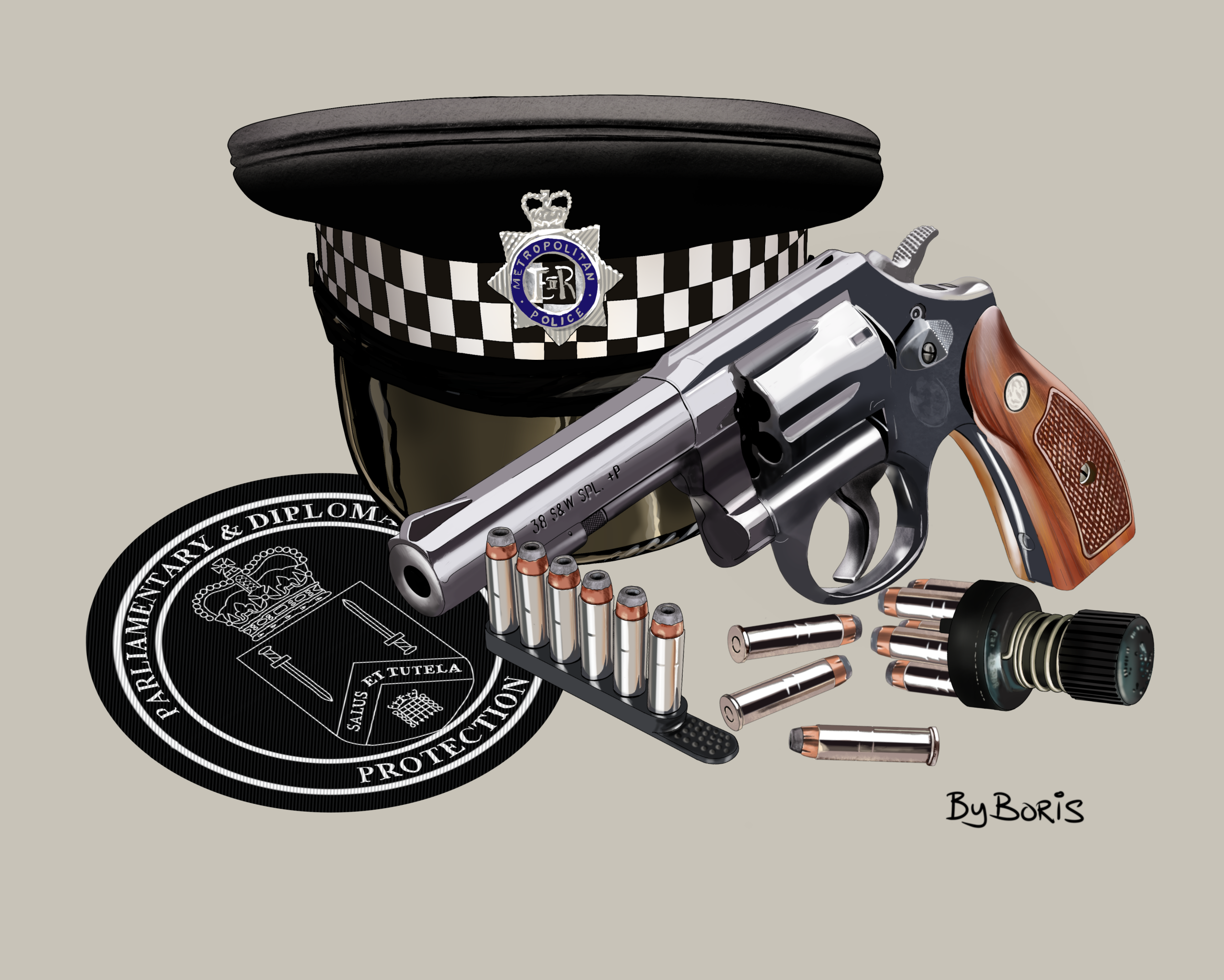 SO16 Patch, Met Flat Cap, Smith & Wesson Model 10 and Ammo Mounted Print 12ins x 10ins.