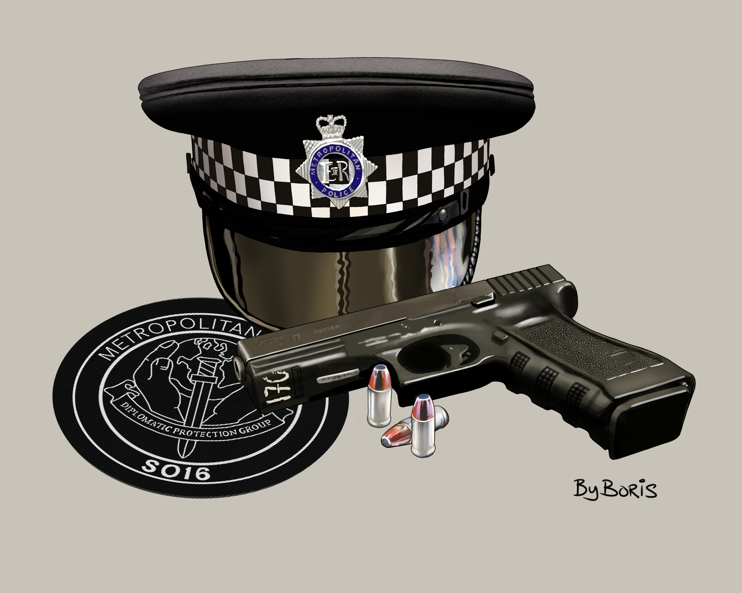 SO16 Patch, Met Flat Cap, Glock and Ammo Mounted Print 12ins x 10ins.