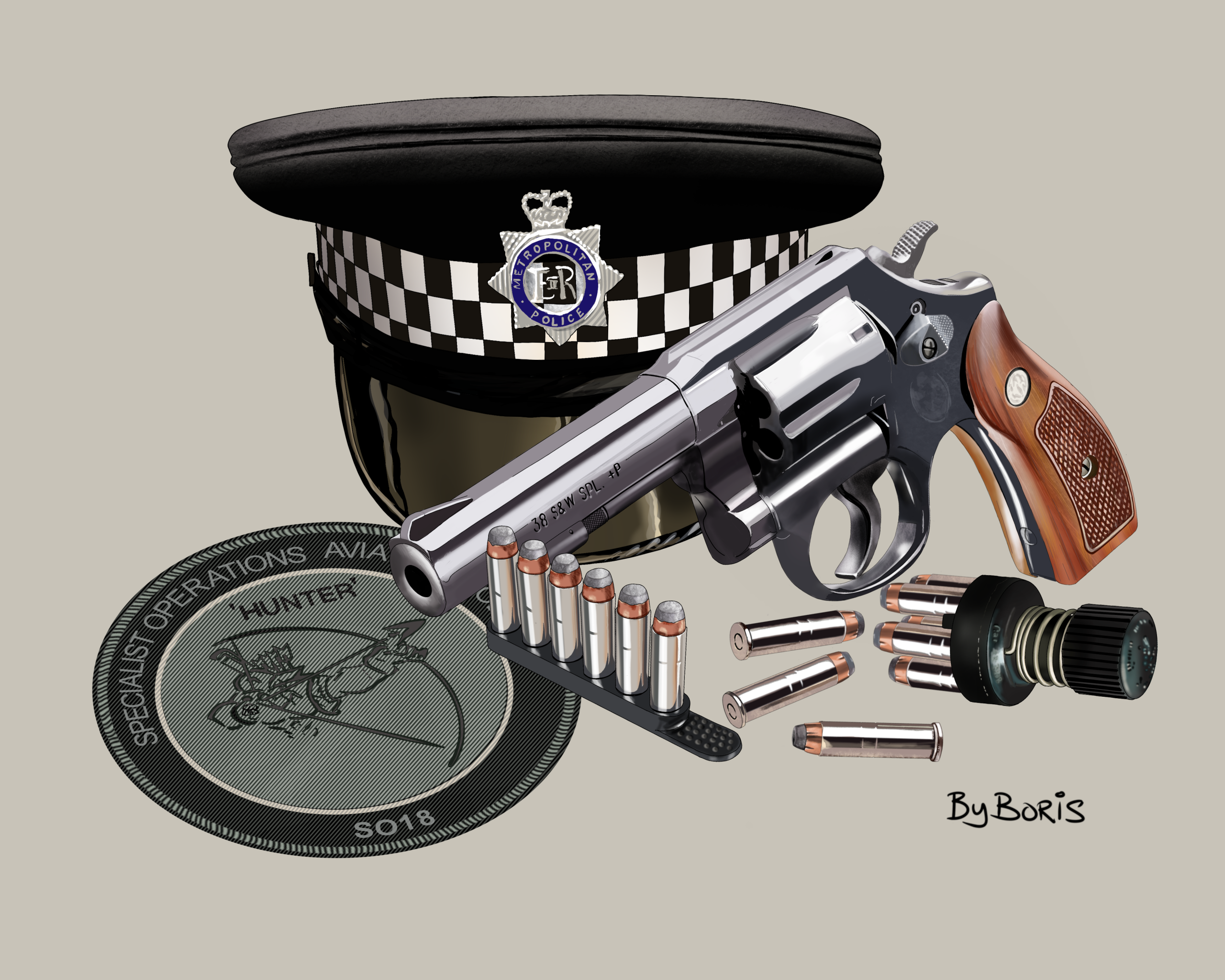SO18 Patch, Met Flat Cap, Smith and Wesson and Ammo Mounted Print 12ins x 10ins.