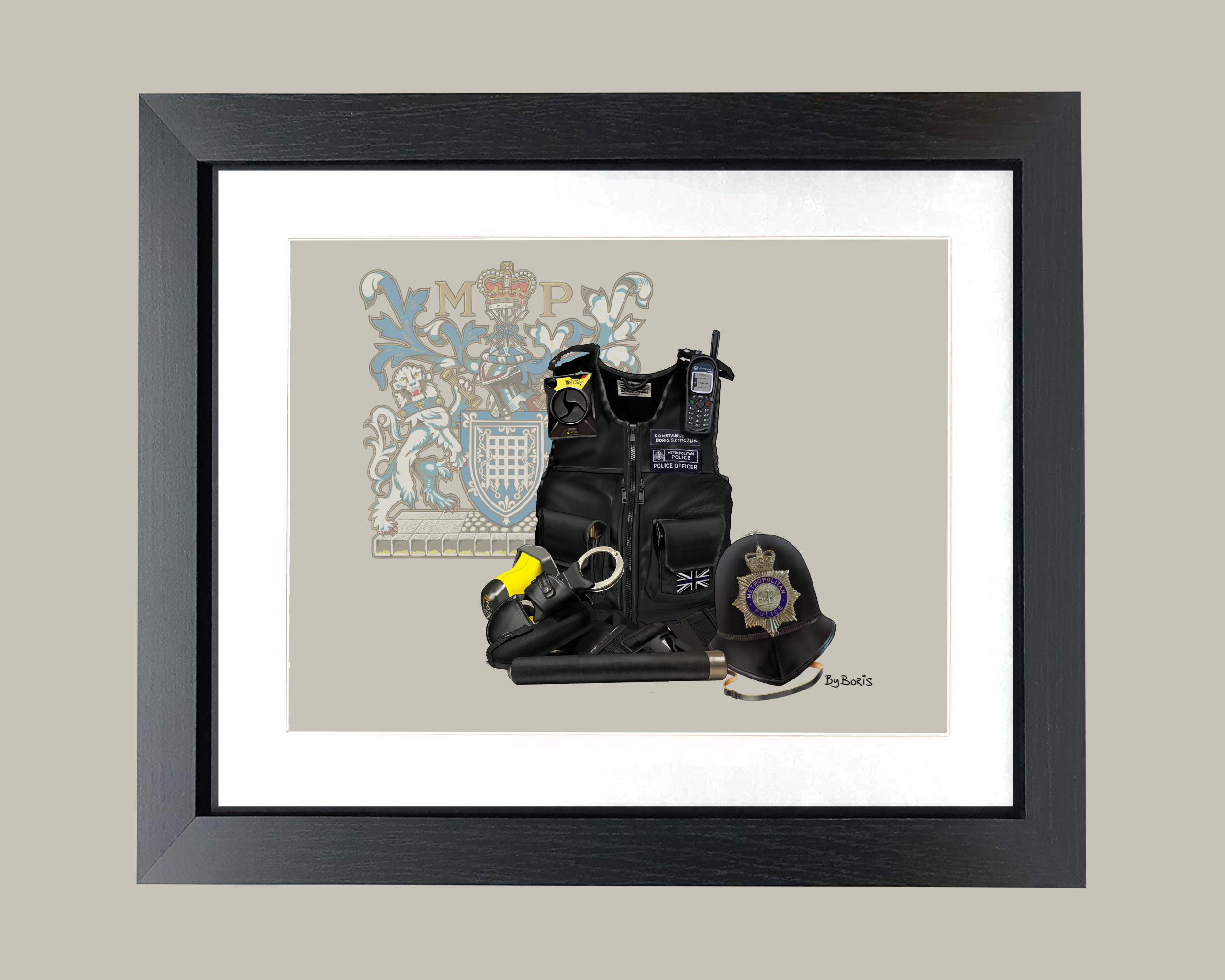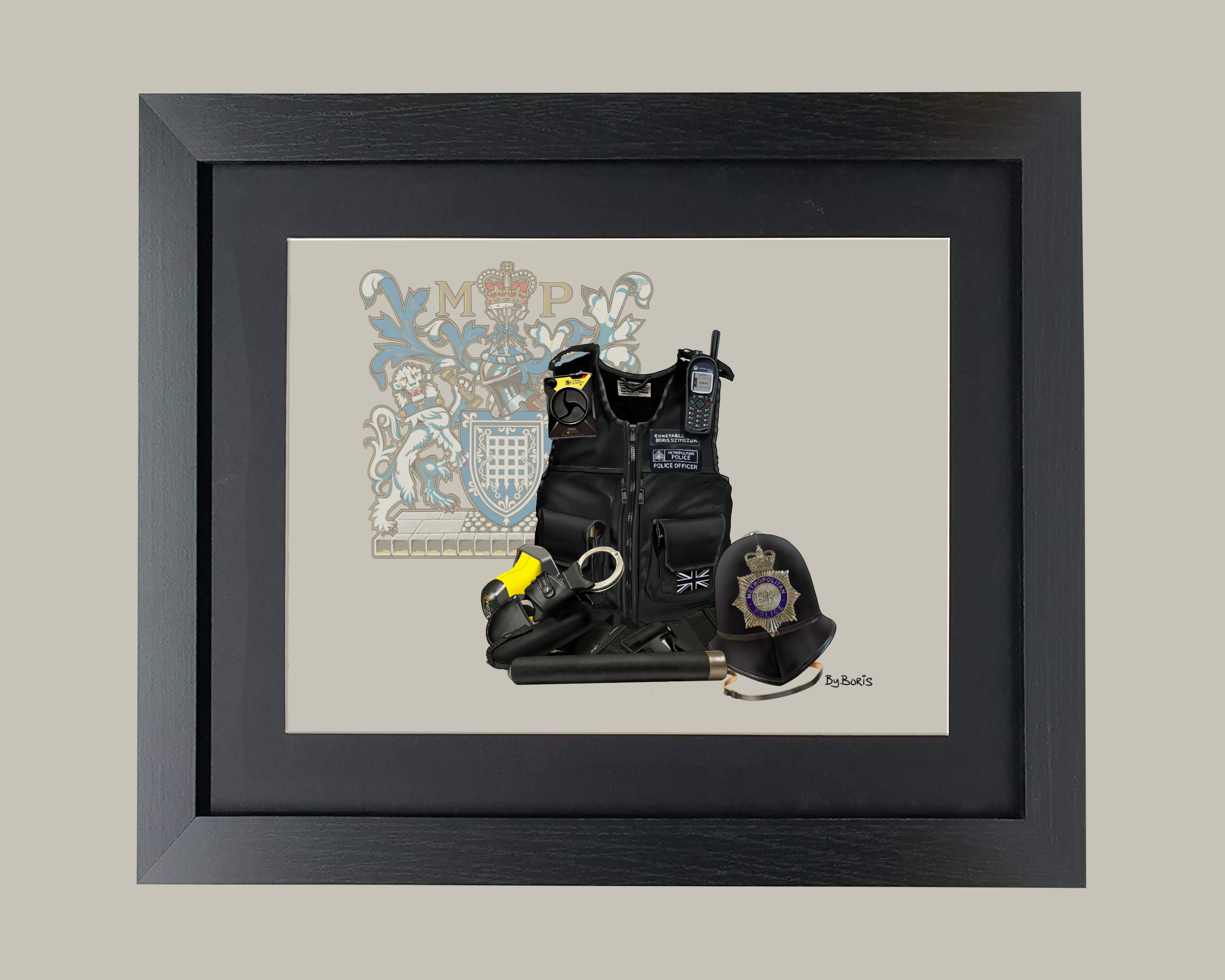 Met Stab Vest, Belt and Helmet Framed Print 12ins x 10ins.