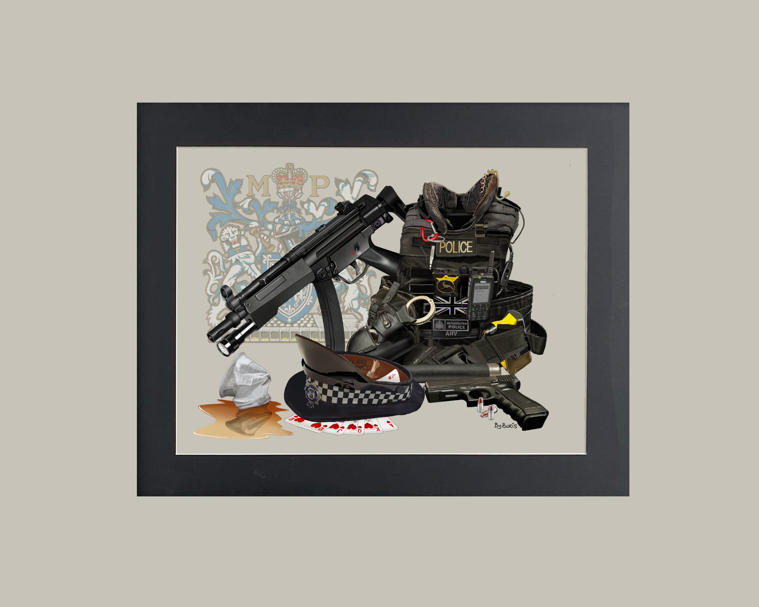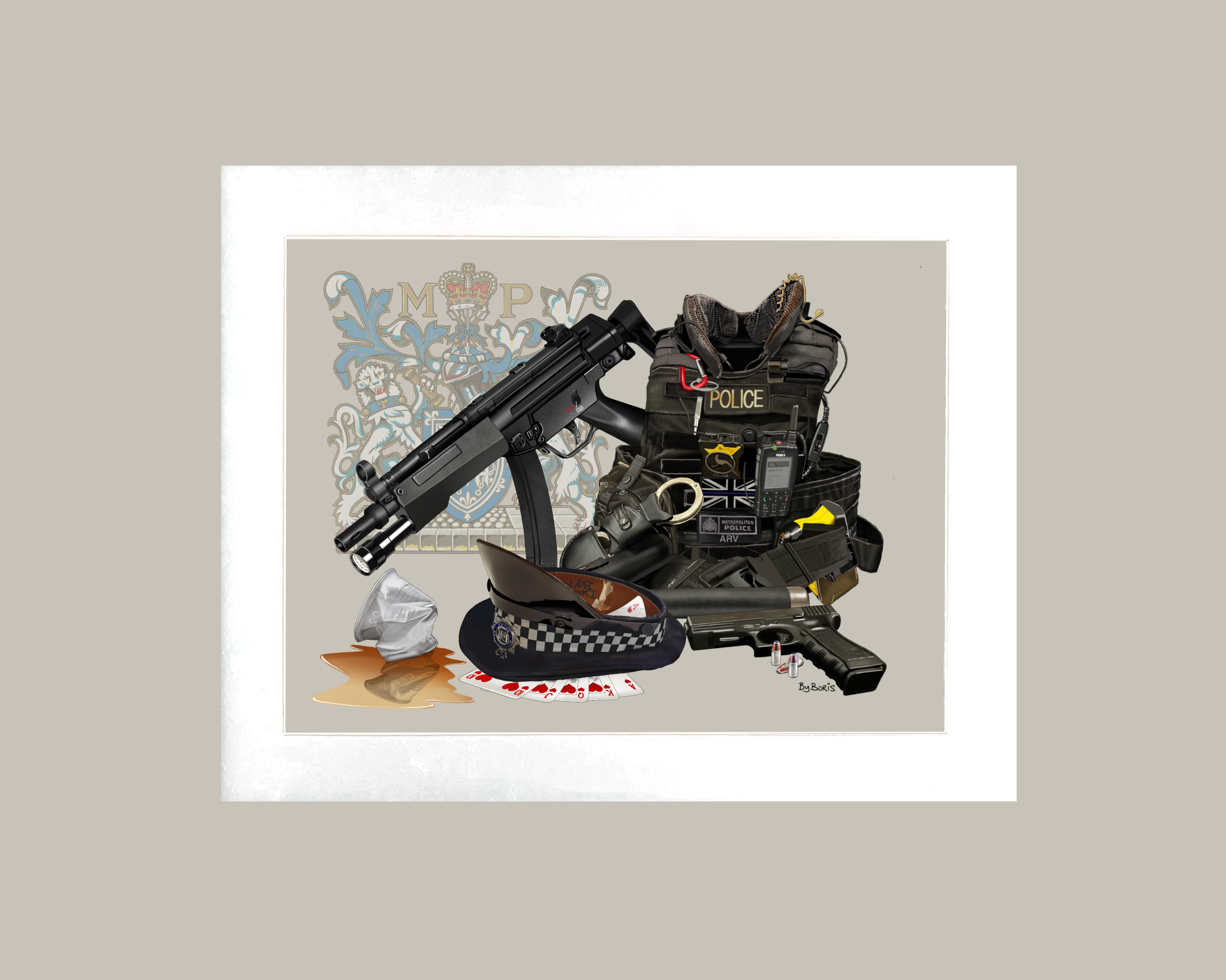 This is a digital illustration of a the ARV vest and include the H & K MP5, Glock 17, Flat Cap, Coffee Cup and Playing Cards which I digitally painted in Procreate.