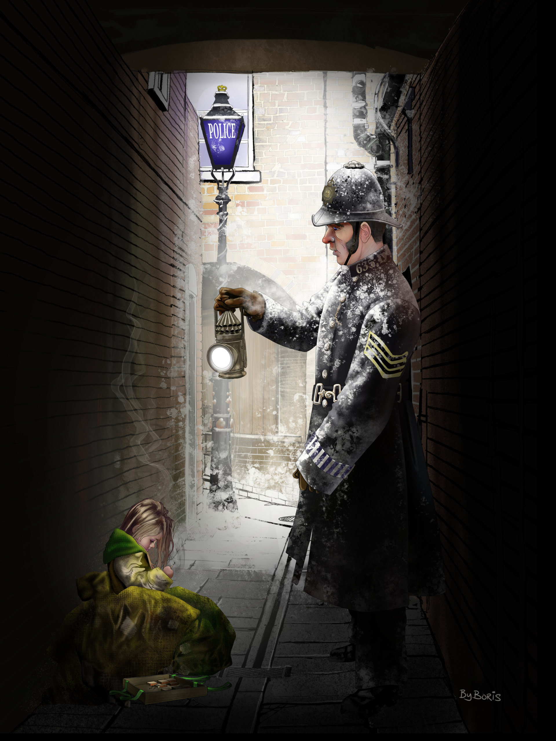 This is an Victorian era police themed illustration of a Constable finding a matchstick girl in an alleyway on a winters evening. I used an old photo of my daughter Jasmine when she was four as a reference for the match girl. I digitally painted this in Procreate, this artwork took around 30 hours to complete over 5 days.