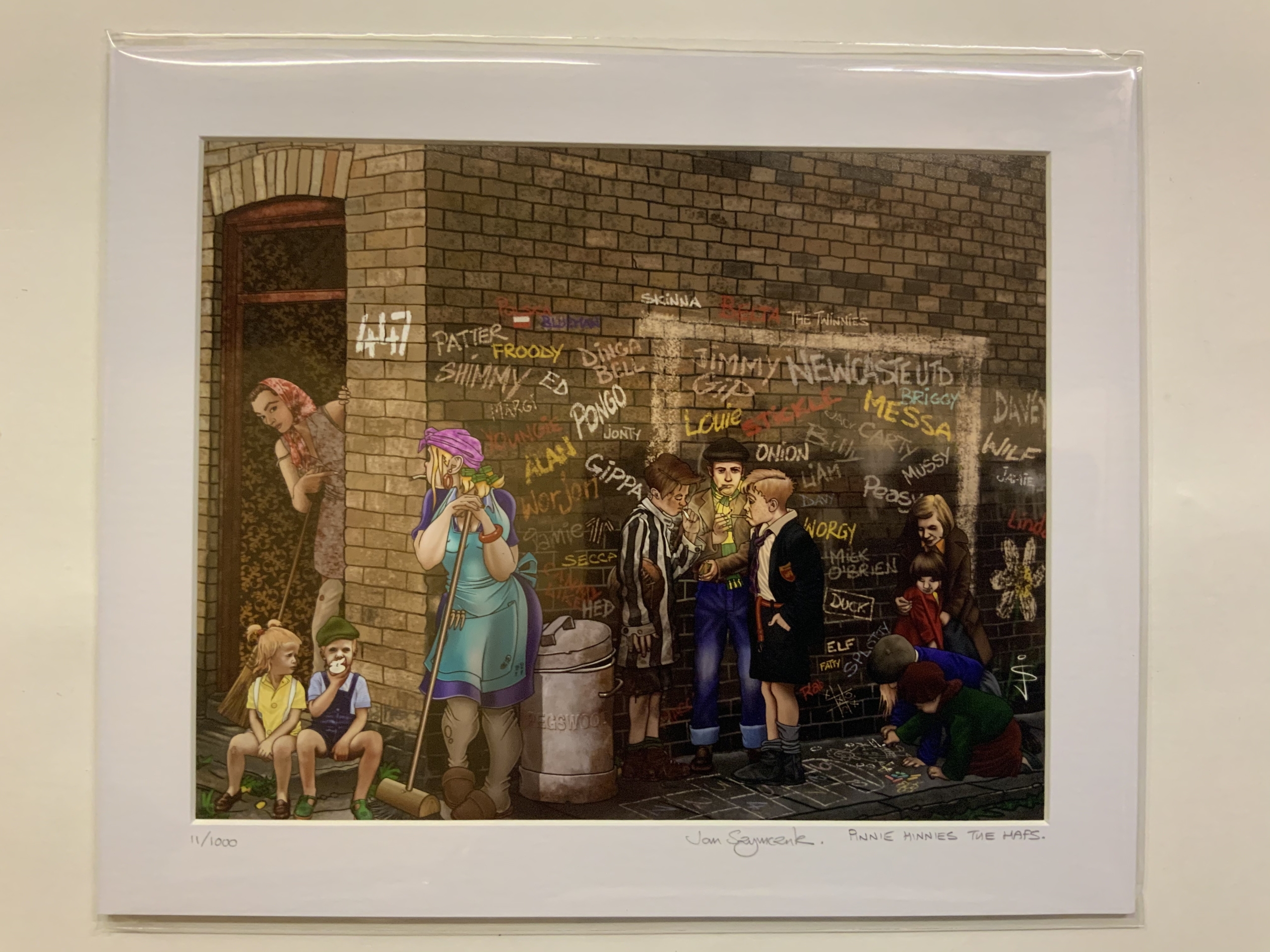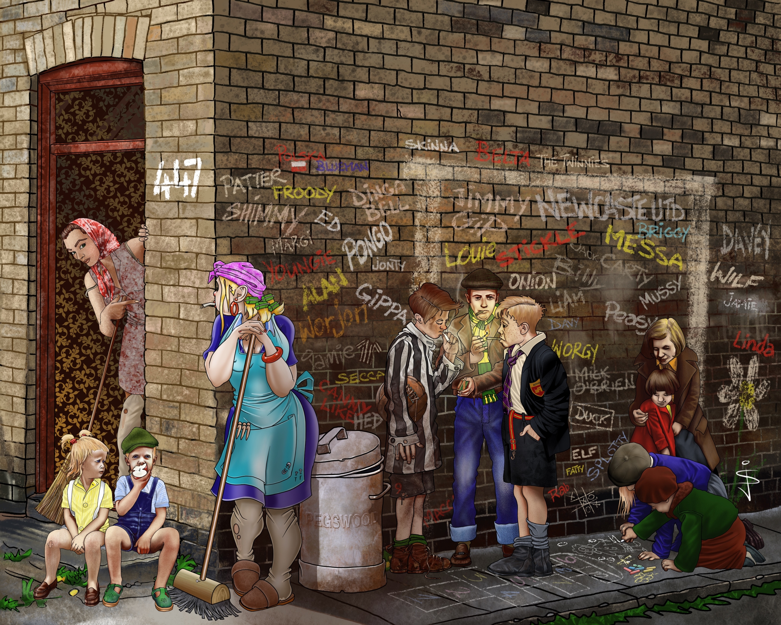 The original artwork was entirely sketched on an iPad Pro 12.9 using the Procreate App, and is one of a series I have created of Pinnie Hinnies, which tries and recaptures my memories of growing up as a child in the small mining village of Pegswood in Northumberland. The term “Hinnies” is the local name for woman in the North East, and were know to wear a variety of pinnies or aprons, hence the name of the series Pinnie Hinnies.