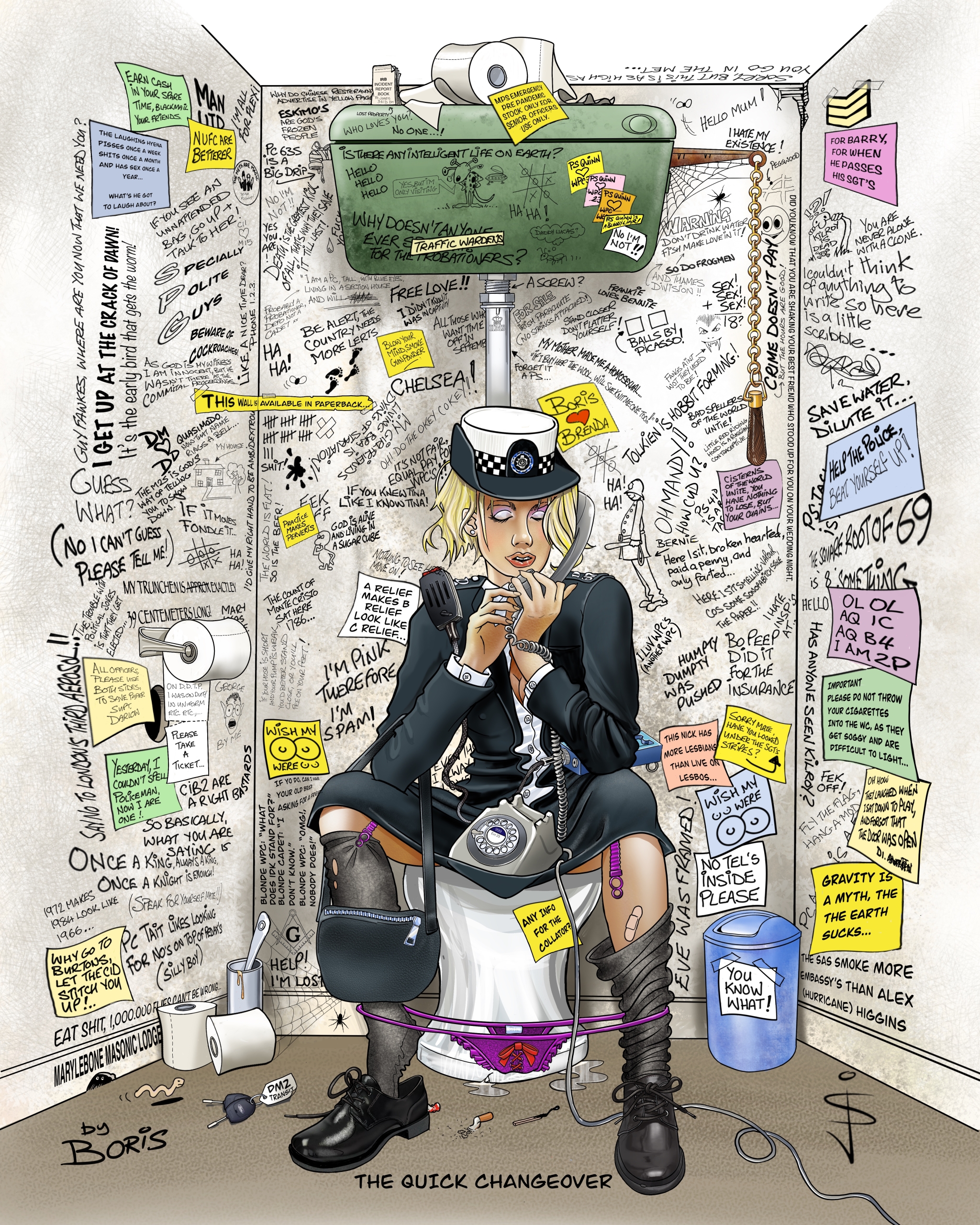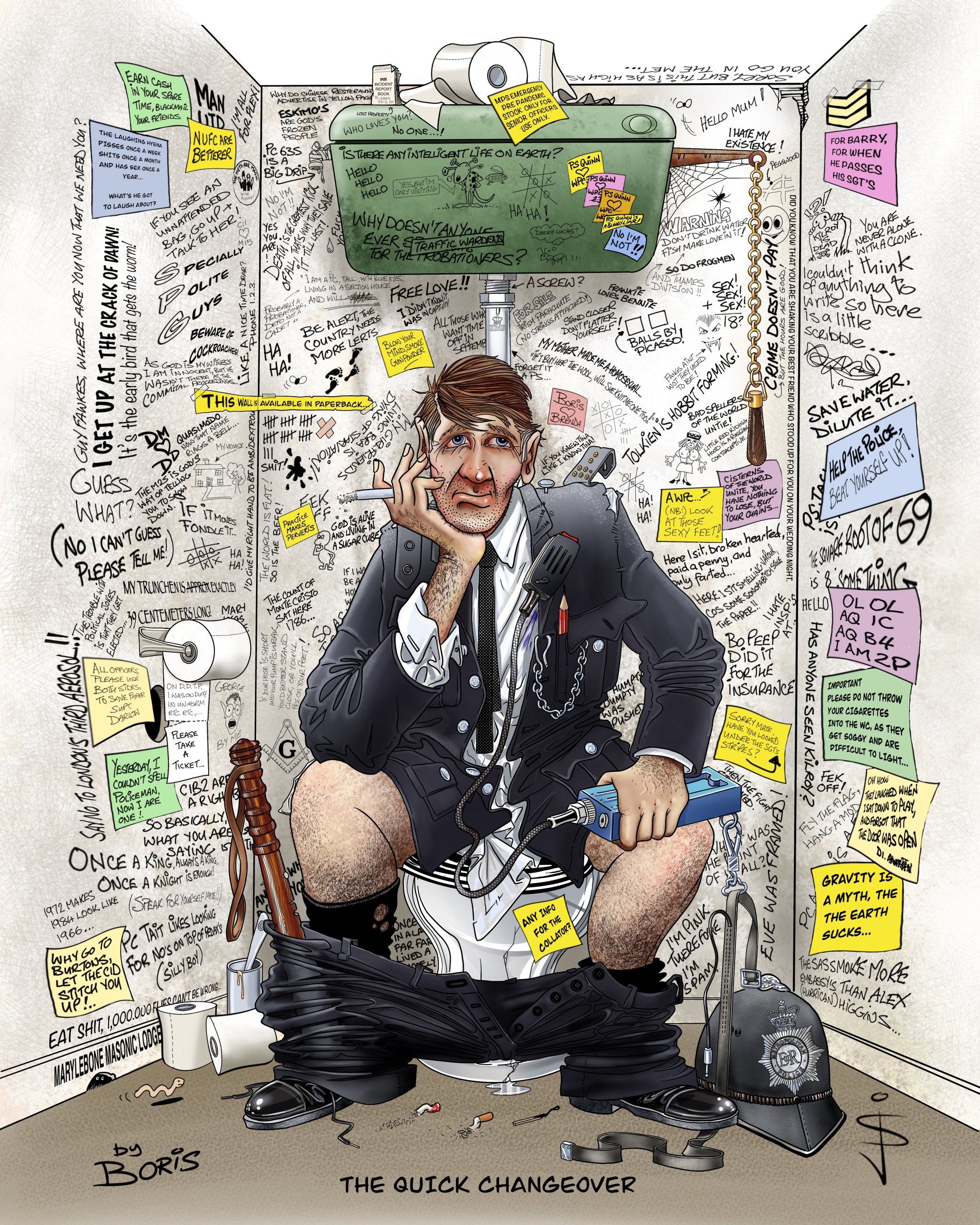 During my service as an SO11 Detective Police Artists, whilst based at New Scotland Yard, I found time to sketch some police orientated cartoons, these cartoons by Boris (my Police nickname) were very popular, and this one was the one, The Quick Changeover, was the one I seem to be remembered for the most. The Quick Changeover refers to when you had a period of eight hours between two working shift rotas.