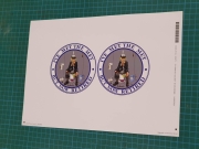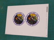 They are printed on on white plastic vinyl and are 10cm x 10cm and are available in sheets of two