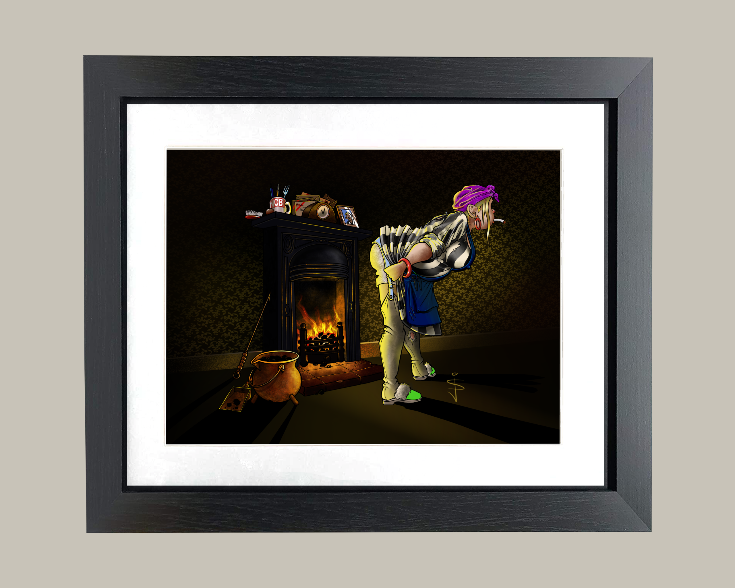 The original artwork was entirely sketched on an iPad Pro 12.9 using the Procreate App, and is one of a series I have created of Pinnie Hinnies, which tries and recaptures my memories of growing up as a child in the small mining village of Pegswood in Northumberland. The term “Hinnies” is the local name for woman in the North East, and were know to wear a variety of pinnies or aprons, hence the name of the series Pinnie Hinnies.