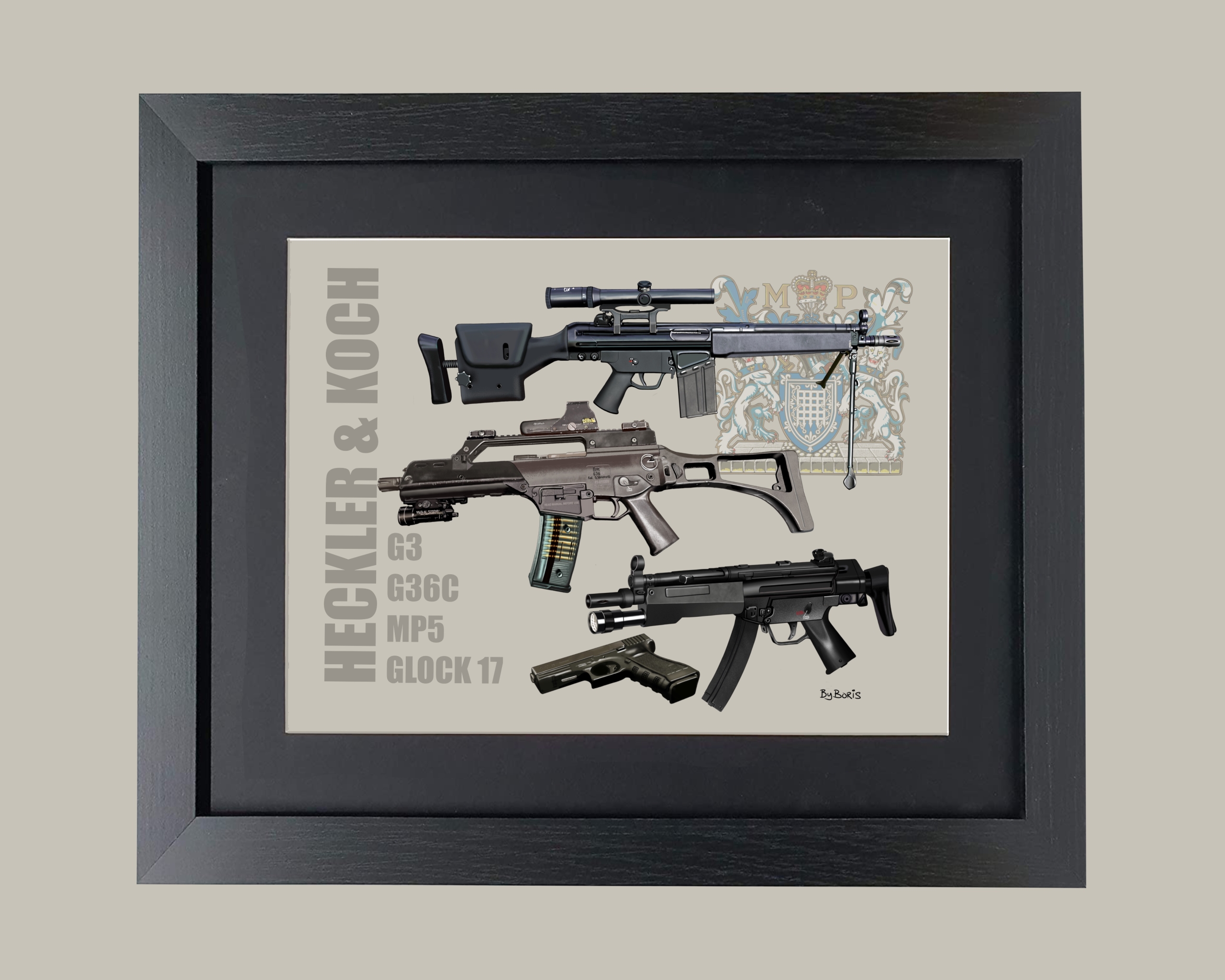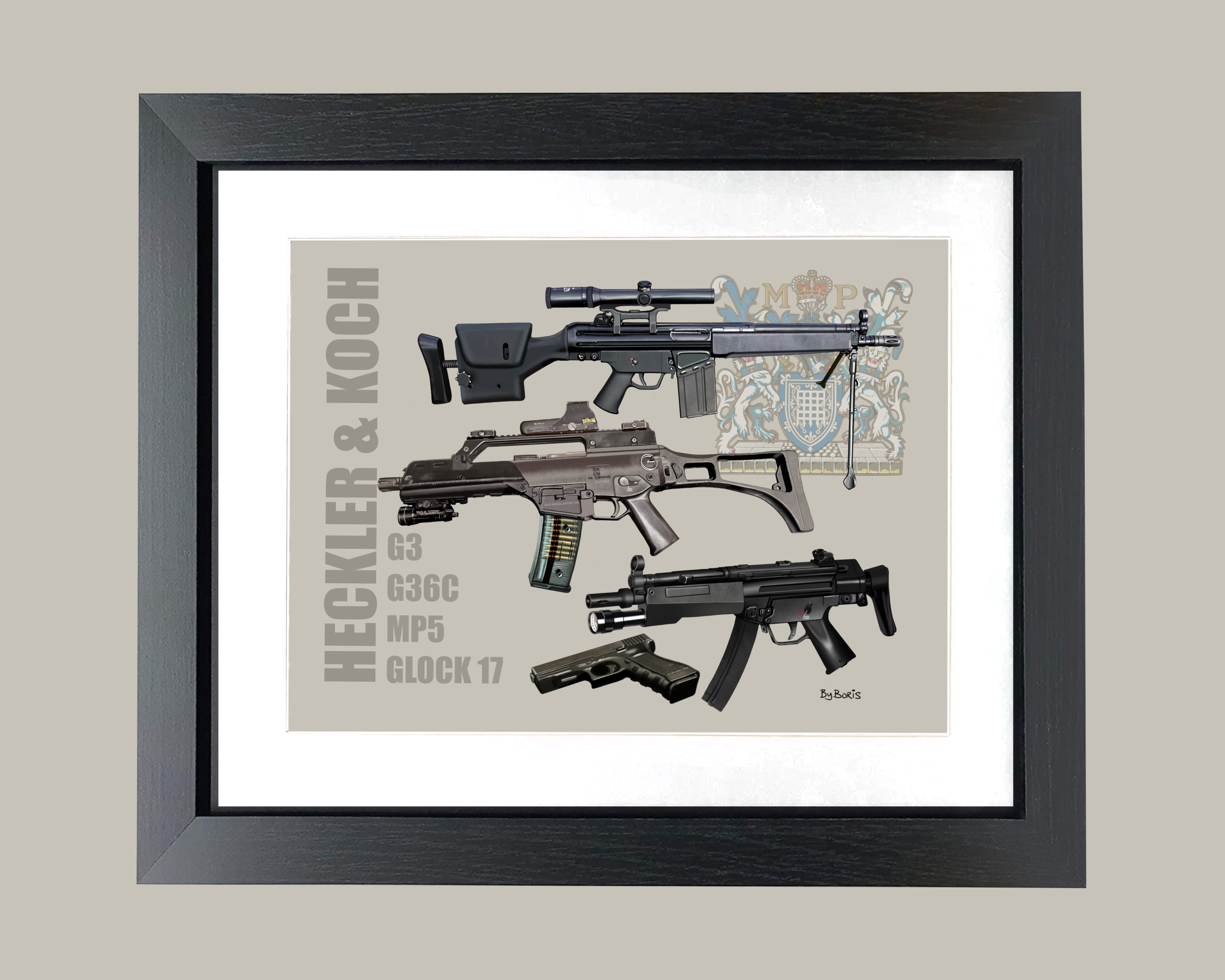 This was inspired by my visit to the Met Police EXPO 23 and I had the chance to take a few photos of the current Police firearms. This peaked my interest enough to digitally paint them and make a montage of Met Firearms featuring the Heckler & Koch G3, G36C, MP5 and Glock 17.
