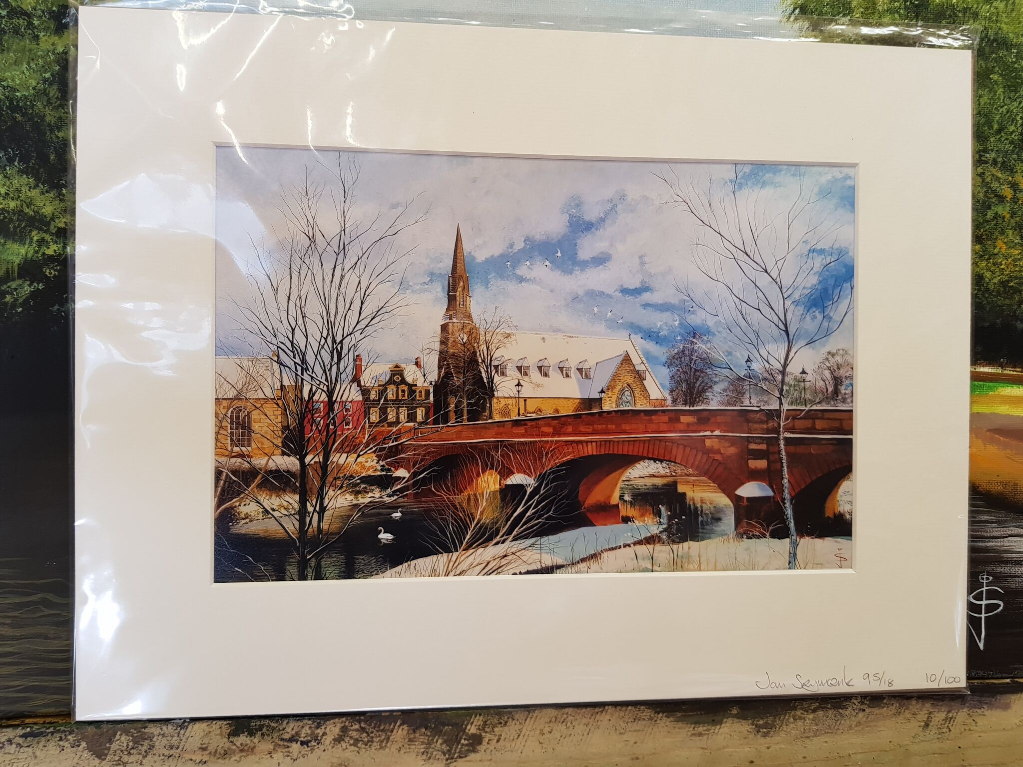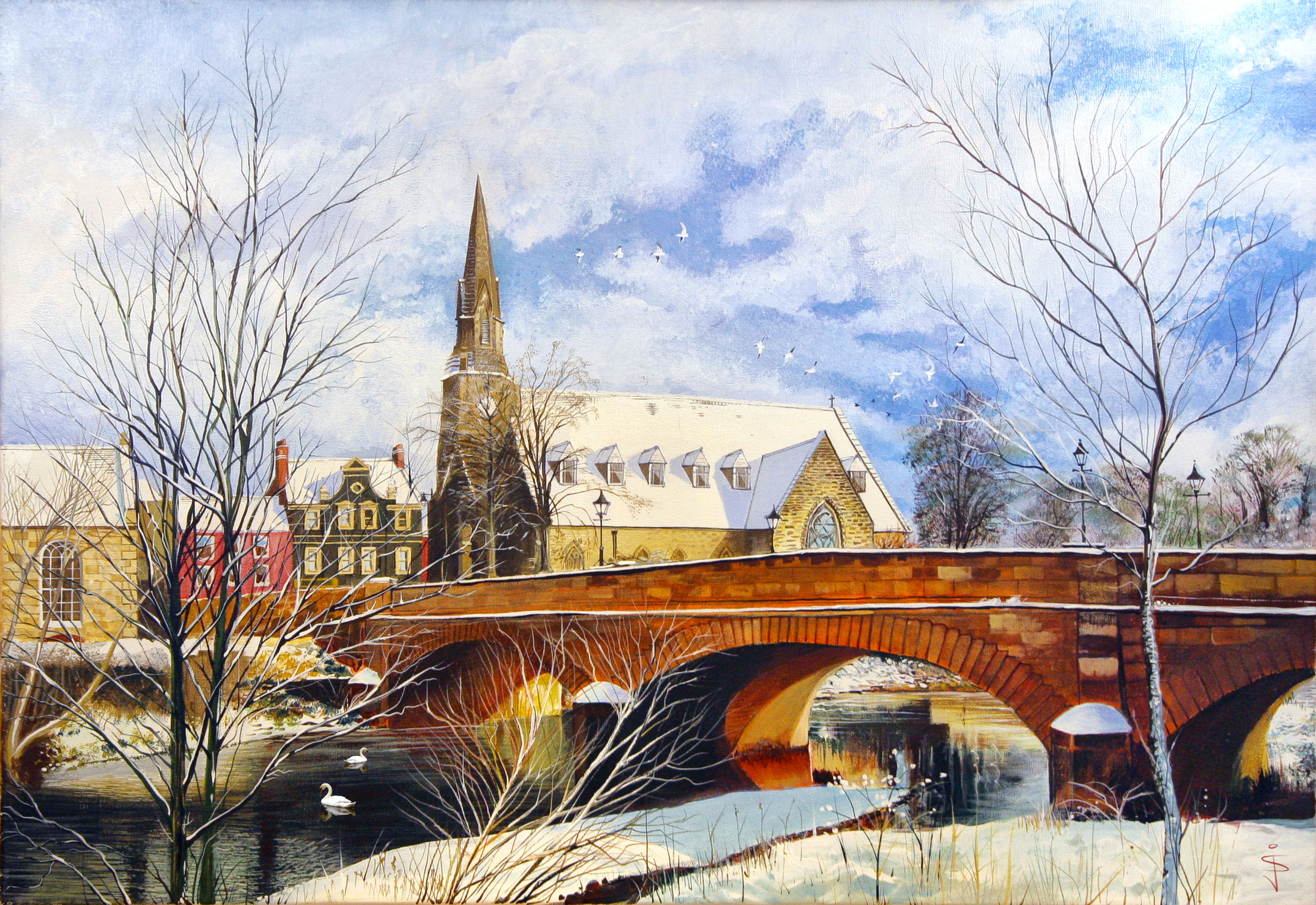 Morpeth Town - The original artwork was painted in acrylics, and captures Morpeth Town in the Winter, with St. Georges Church standing at the far end of the Telford Bridge as it straddles the river Wansbeck in the heart of the Market Town of Morpeth.